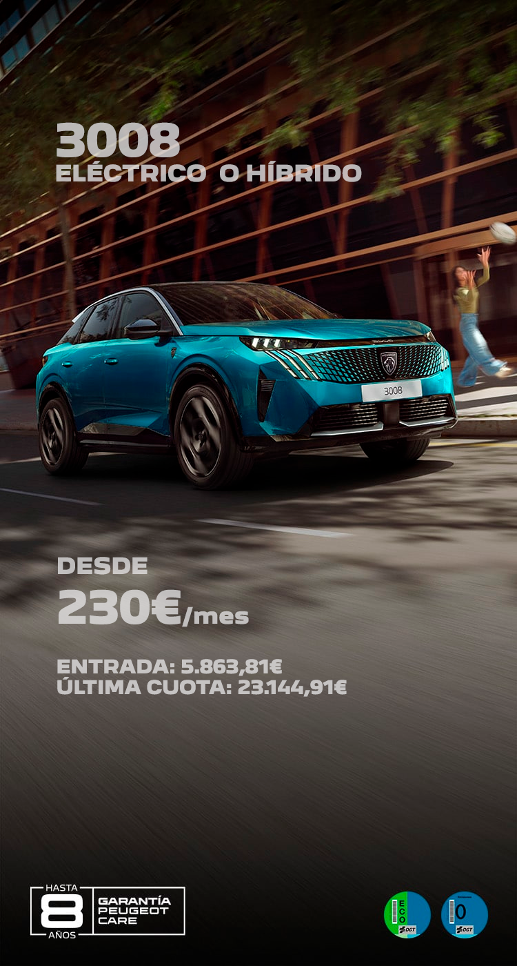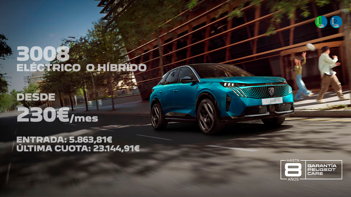 La Garantía PEUGEOT Care está disponible en la última generación de la gama Peugeot 100% eléctrica: E-208, E-2008, E-308, E-308 SW, E-3008, E-408, E-5008, E-Rifter (Homologación M1), E-Traveller, y también en la gama térmica e híbrida enchufable, para pedidos realizados a partir del 1 de septiembre de 2024: 208, 2008, 308, 308 SW, 308 PLUG-IN HYBRID, 308 SW PLUG-IN HYBRID, 408, 408 PLUG-IN HYBRID, 3008, 3008 PLUG-IN HYBRID, 5008, 5008 PLUG-IN HYBRID, 508, 508 PLUG-IN HYBRID, 508 SW y 508 SW PLUG-IN HYBRID, y para pedidos a partir del 1 de mayo de 2025 en Rifter (Homologación M1) y Traveller.